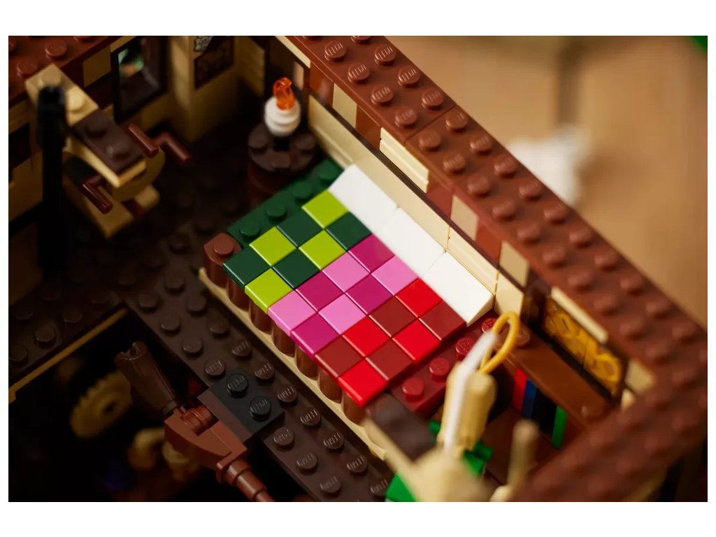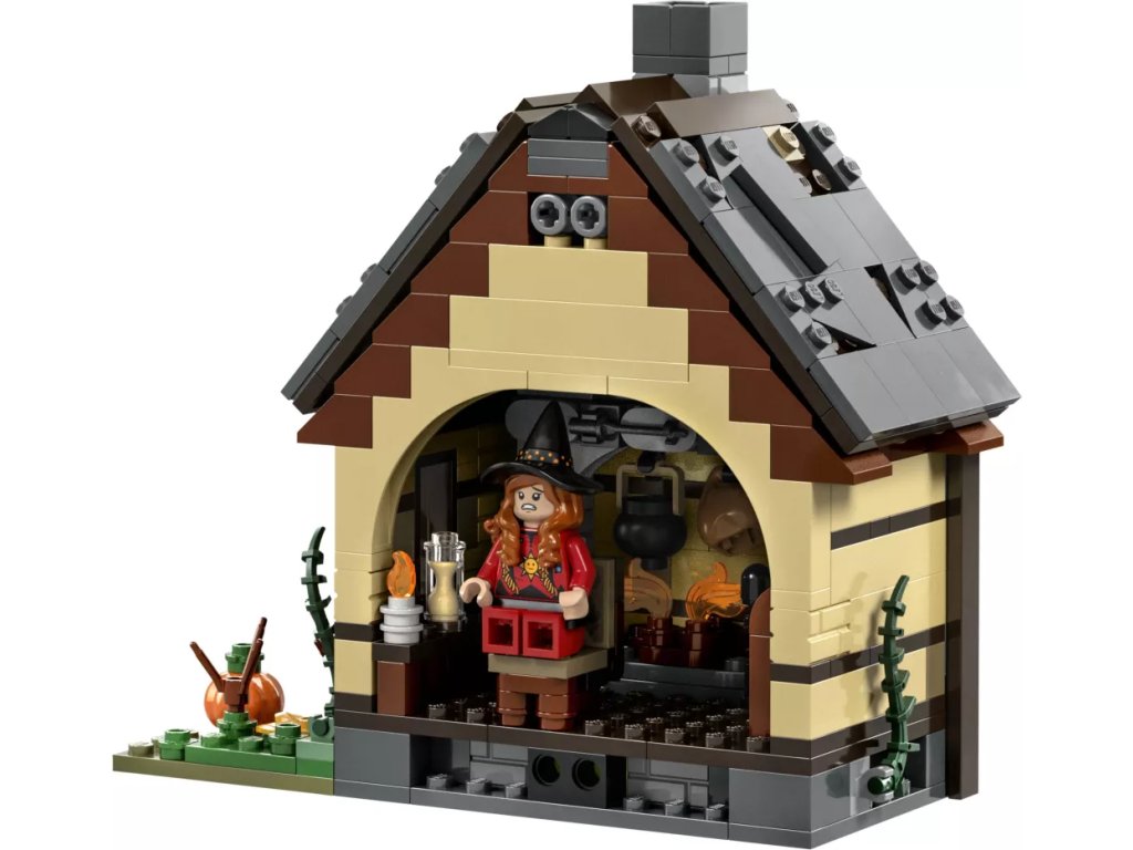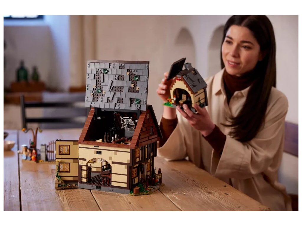 - Zábavné funkce – Otáčejte vodním kolem a z komínu bude stoupat růžový „dým“, aktivujte světelnou kostku LEGO® a zapalte tak oheň pod kotlíkem, otevřete čarodějnickou Knihu kouzel a mnoho dalšího