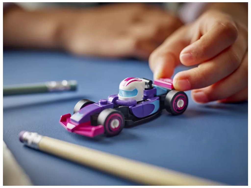 - Pohyblivá kola – Každé vozidlo LEGO® je zdobené týmovými barvami, logy a má pohyblivá kola, aby děti mohly pořádat vlastní závody, a v každém kokpitu najdete helmu