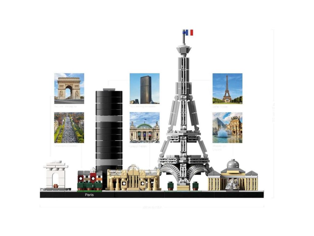 - Součástí je brožurka, ve které najdete informace o designérovi, architektuře a historii každé budovy, a také historické informace o Paříži a o jejím architektonickém dědictví. (K dispozici pouze ve francouzštině a angličtině. Překlady do dalších jazyků je možné si stáhnout na LEGO.com/architecture).