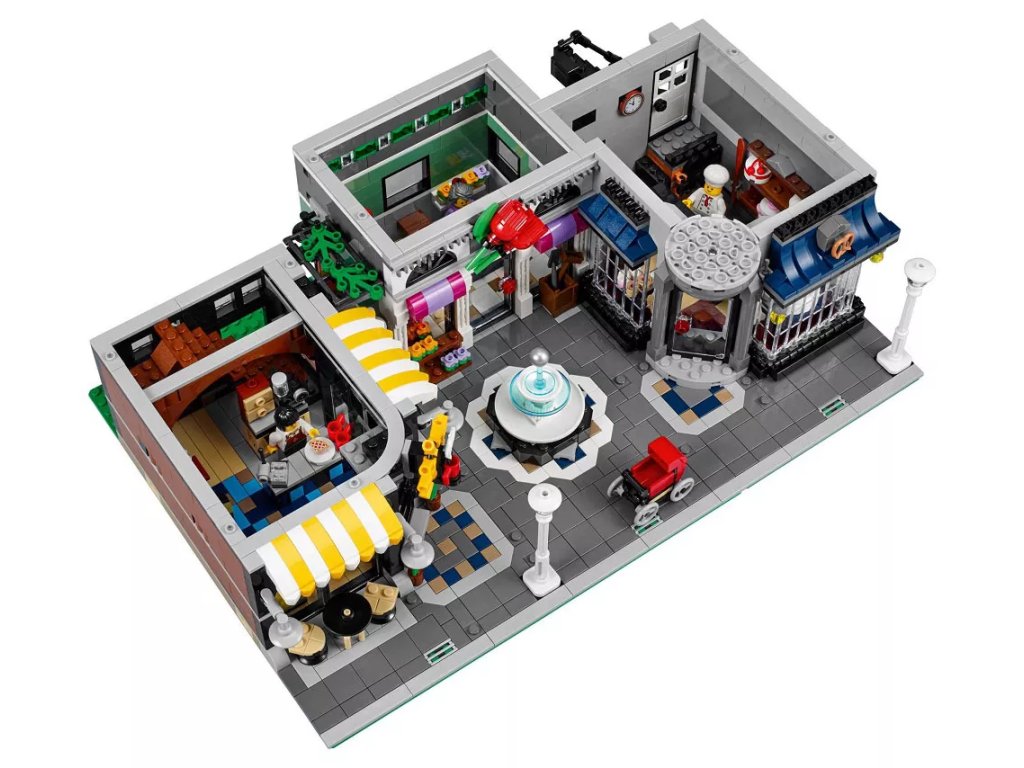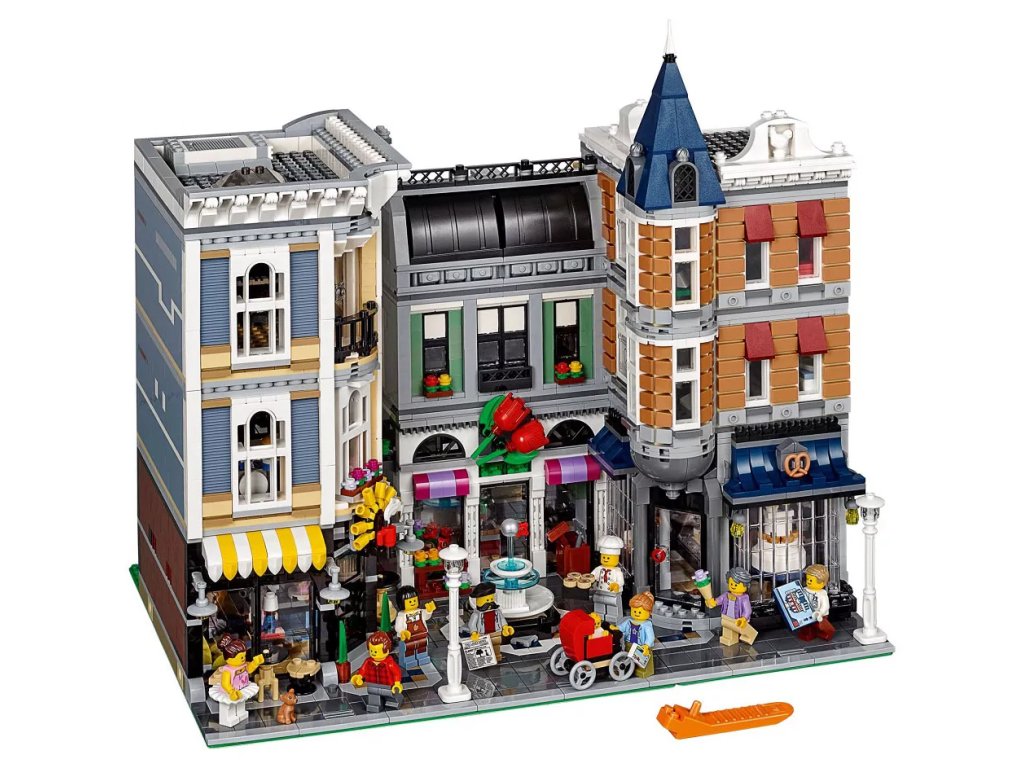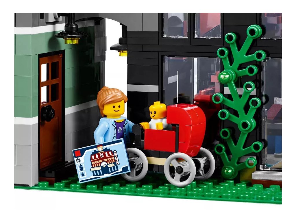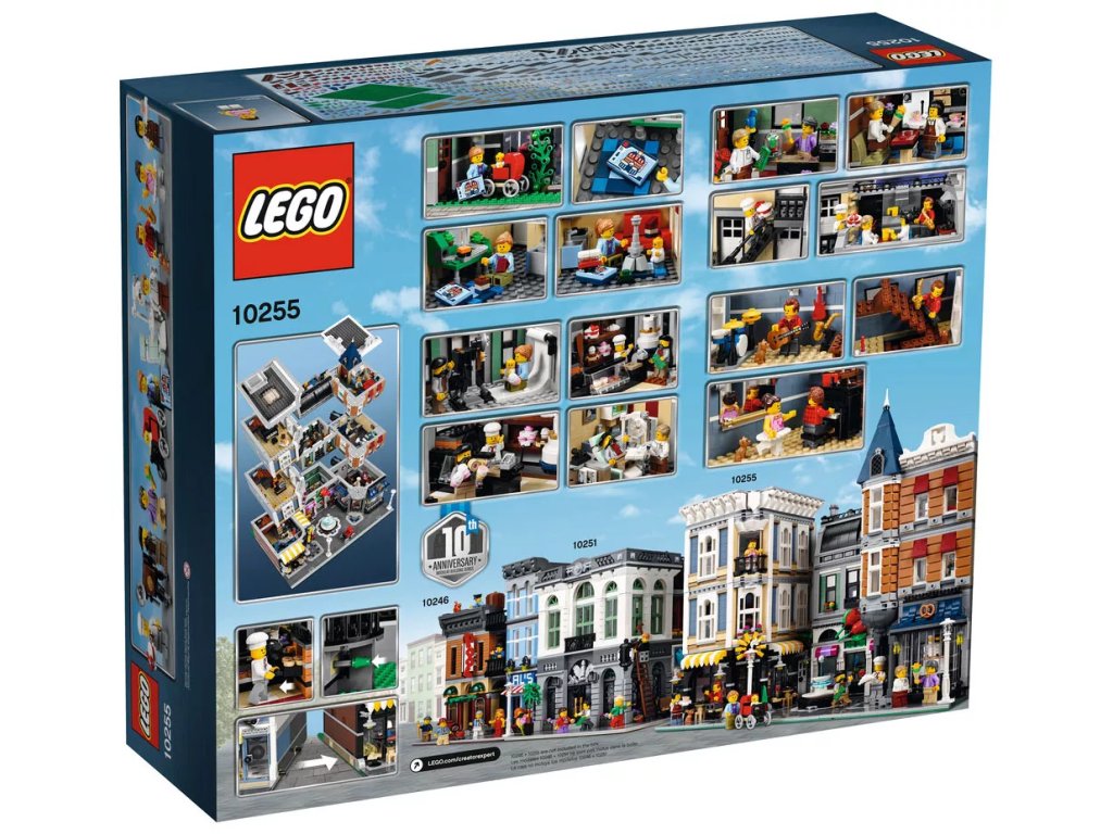 Udělej si výlet na úžasné Shromáždění na náměstí vyvinuté k oslavě deseti let LEGO® Modulárních budov. Tato sada obsahuje spoustu nepřekonatelně geniálních detailů a skrytých překvapení. Snadno snímatelné části budov poskytují přístup do dokonale propracovaných interiérů, které v přízemí obsahují pekárnu, květinářství a kavárnu, v první patře obchod s hudebninami, fotografický ateliér a zubní ordinaci, a ve druhém patře taneční ateliér a byt s přístupem na střešní terasu s grilem. Exteriér budovy obsahuje detailní chodník s venkovním nábytkem kavárny, fontánou, pouličními lampami a skvěle propracovanou fasádou s krásnými detailními okny a dveřmi, třemi postavitelnými cedulemi obchodů, věží a ozdobnou střechou. Součástí je osm minifigurek a figurka miminka.