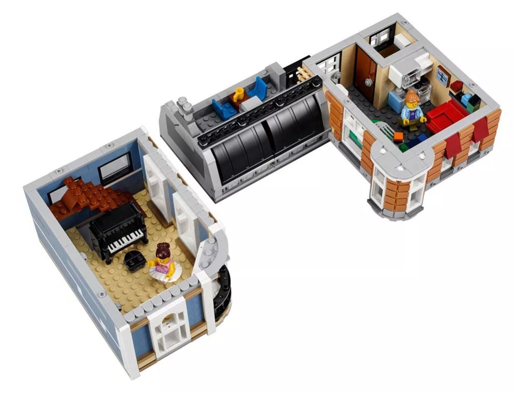 - Druhé patro obsahuje taneční ateliér s postavitelným piánem a lesklým zrcadlem; byt s postavitelným rozkládacím gaučem, detailní kuchyní, záchodem, mikro LEGO® vláčkem, modulárními budovami a Eiffelovou věží, a přístup na střešní terasu s postavitelným grilem, stolem a opadávající barvou.