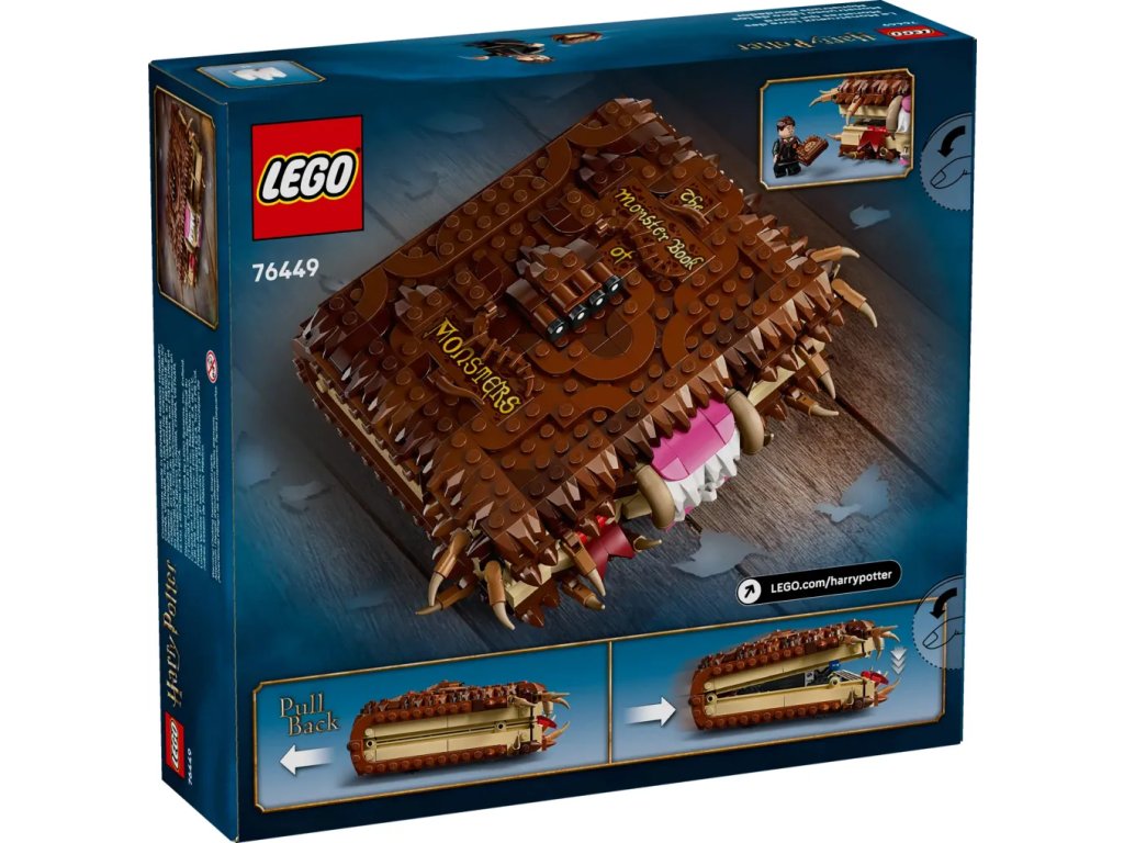 Darujte malému kouzelníkovi, čarodějce nebo mudlovi hodiny kouzelného hraní se stavebnici LEGO® Harry Potter™ (76449) Hryzající kniha Obludné obludárium. Tato zábavná fantasy stavebnice obsahuje propracovanou kostkovou repliku Obludného obludária, učebnice o péči o kouzelné tvory. Model má skrytá kola a natahovací funkci – knihu položte na rovnou plochu, natáhněte, pusťte ji a sledujte, jak se řítí pryč a při tom žvýká.