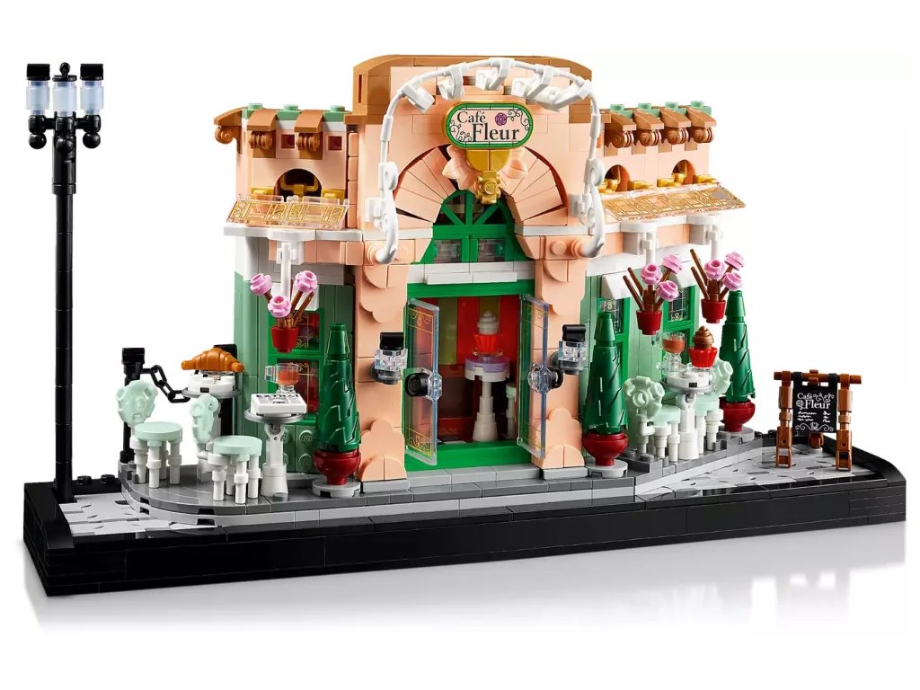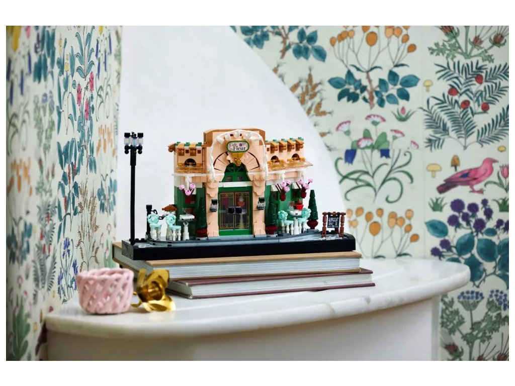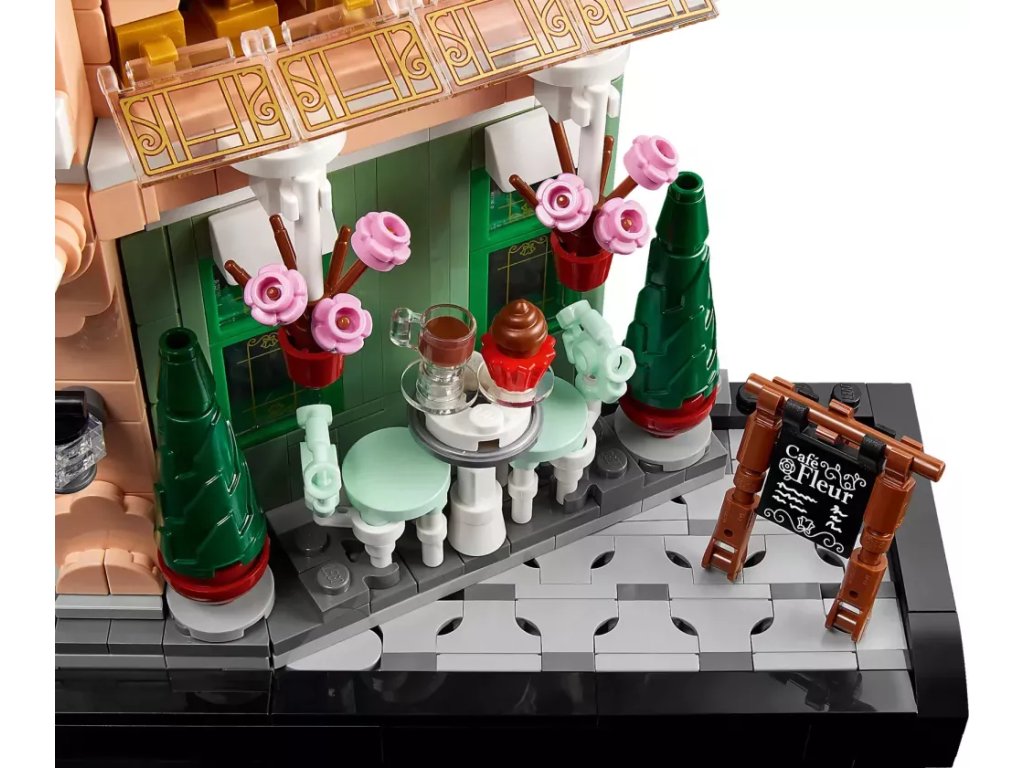 Chodník z kostek s klasickým pouličním osvětlením dokonale dokresluje atmosféru kavárny Café Fleur s malebnou fasádou, zdobeným posezením, zavěšenými květináči a dvojitými dveřmi, které lze otevřít a odhalit útulný interiér s královskými tapetami a nábytkem z tmavého dřeva. Model je plný propracovaných detailů a doplňků, jako jsou croissanty, šálky, noviny a pokladna, a zachycuje kouzlo klasického francouzského bistra. Model je díky ploché zadní straně úzký a ideální na vystavení na polici.