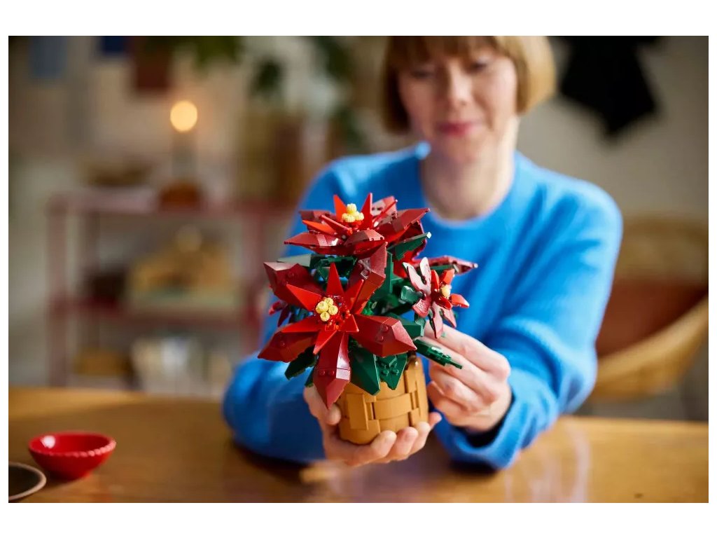 - Kreativní stavebnice pro milovníky rostlin – Tato sada obsahuje vše, co potřebujete k sestavení propracované repliky Vánoční hvězdy z kostek LEGO zasazené do květináče s tkaným košíkem