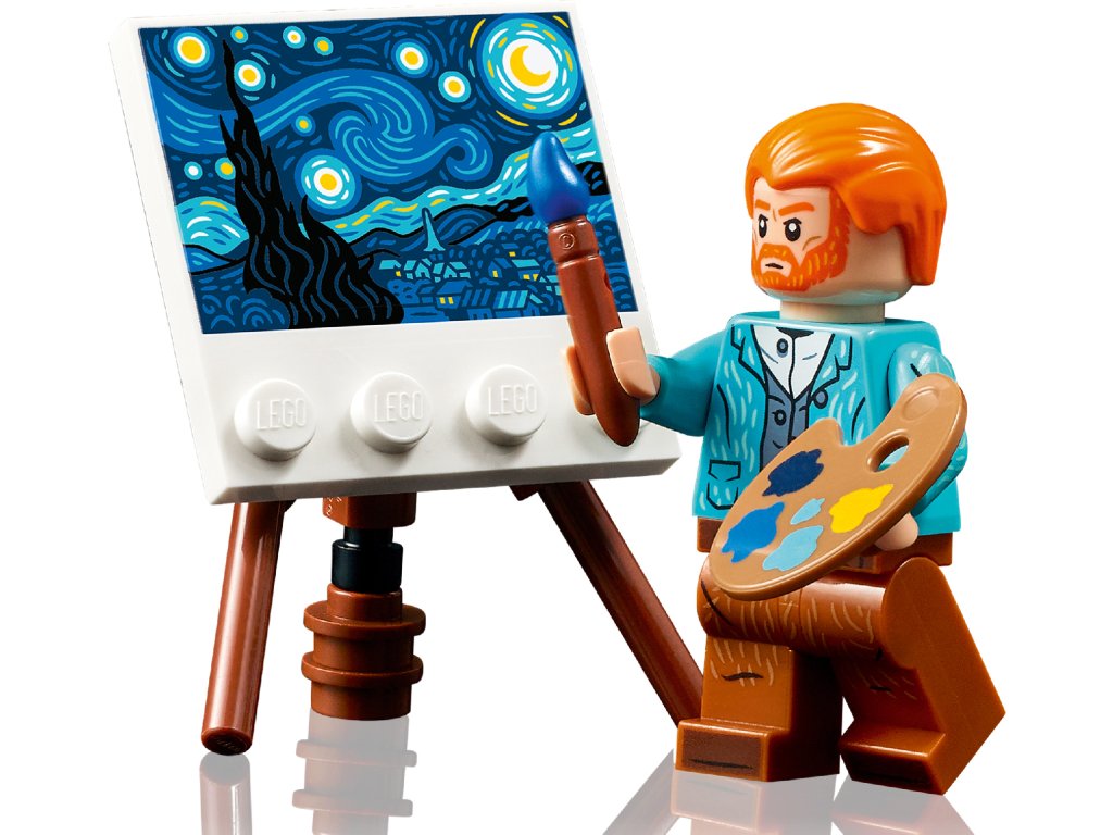 - Nastavitelný výstavní podstavec pro minifigurku Vincenta van Gogha – vystavte si minifigurku se štětcem a paletou před malířským stojanem s miniaturní verzí obrazu Hvězdná noc