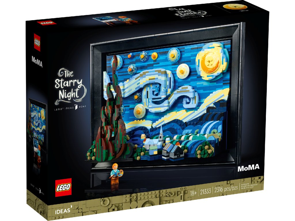 Budujte kreativitu. Budujte soustředění. Budujte z kostek LEGO® vlastní 3D model nejoslavovanějšího uměleckého díla Vincenta van Gogha – Hvězdnou noc – obraz, který je k vidění v Muzeu moderního umění (MoMA) v New Yorku. Objevte inovativní stavitelské techniky, díky kterým vystihnete a zachytíte autorovy tahy štětcem, a výsledné dílo si pověste na zeď nebo volně vystavte. Součástí tohoto úžasně detailního modelu (21333) z řady LEGO Ideas je i nastavitelný podstavec, na který lze umístit minifigurku Vincenta van Gogha se štětcem, paletou a malířským stojanem.