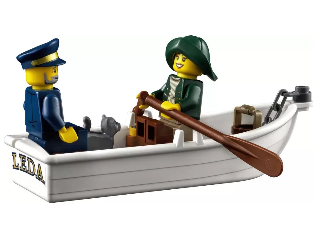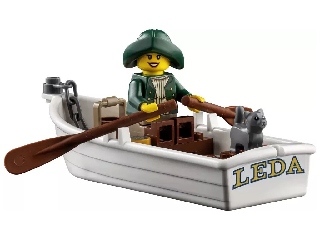 2 minifigurky LEGO® a 2 figurky – Život této scéně vdechnou správce majáku a mořeplavec s modelem veslařského člunu, ale také kočka a racek