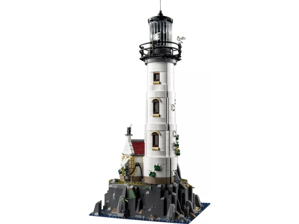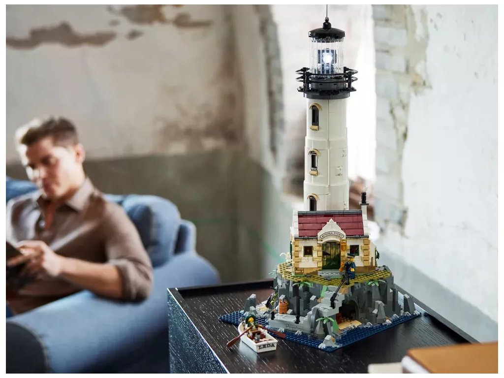 Nechte svou kreativitu zazářit a postavte si Motorizovaný maják (21335) od LEGO® Ideas. Věž majáku je vybavena motorizovaným otáčecím světlem a na míru vyrobenými dílky v podobě Fresnelovy čočky. Nechybí ani chatka s hořícím krbem. Jak chata, tak věž nabízejí snadný přístup k úchvatně propracovanému interiéru. Stavby jsou umístěny na skalnatém výběžku se schody vedoucími k molu a jeskyni ukrývající pirátský poklad. Půvabnou scénu završí minifigurky správce majáku a námořníka, ale také sestavitelný veslovací člun a figurky racka a kočky.