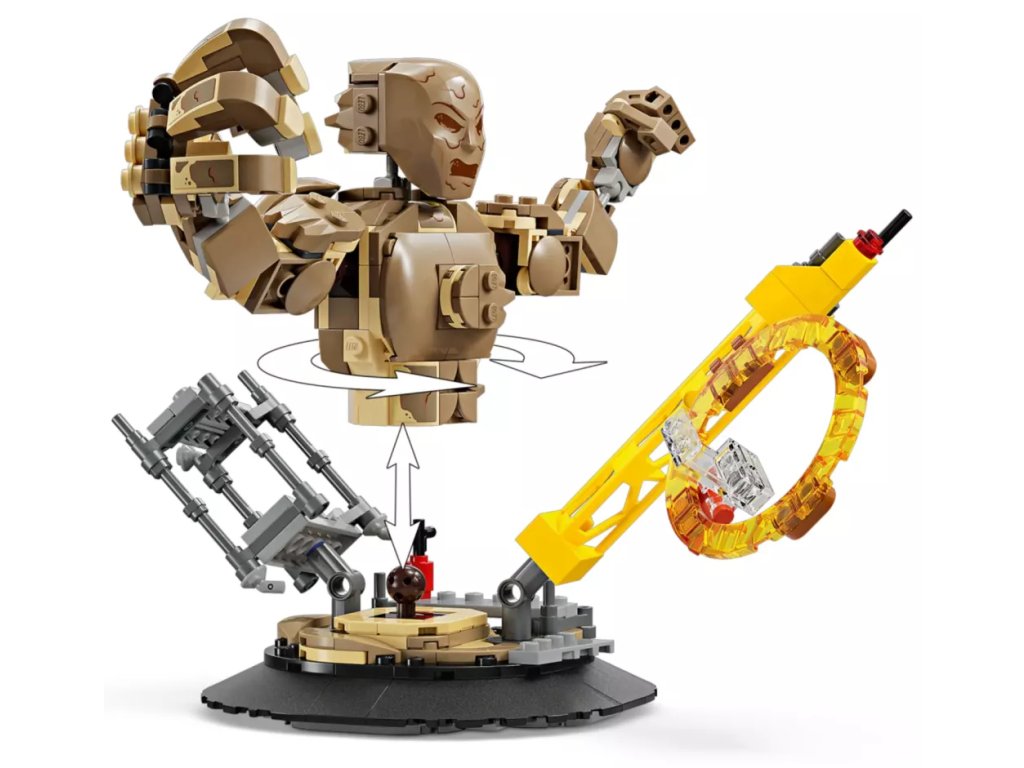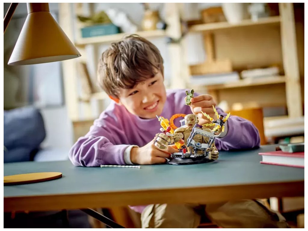 - Parádní bitevní model z kostek LEGO® – Malí fandové filmů od Marvelu mohou otáčet plně pohyblivý model Sandmana a chytat do jeho obřích rukou Spider-Mana, který se nad ním vznáší na svém pavučinovém „laně“