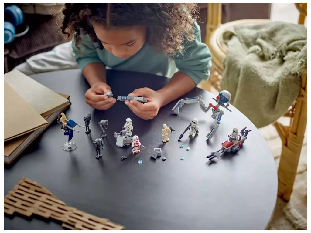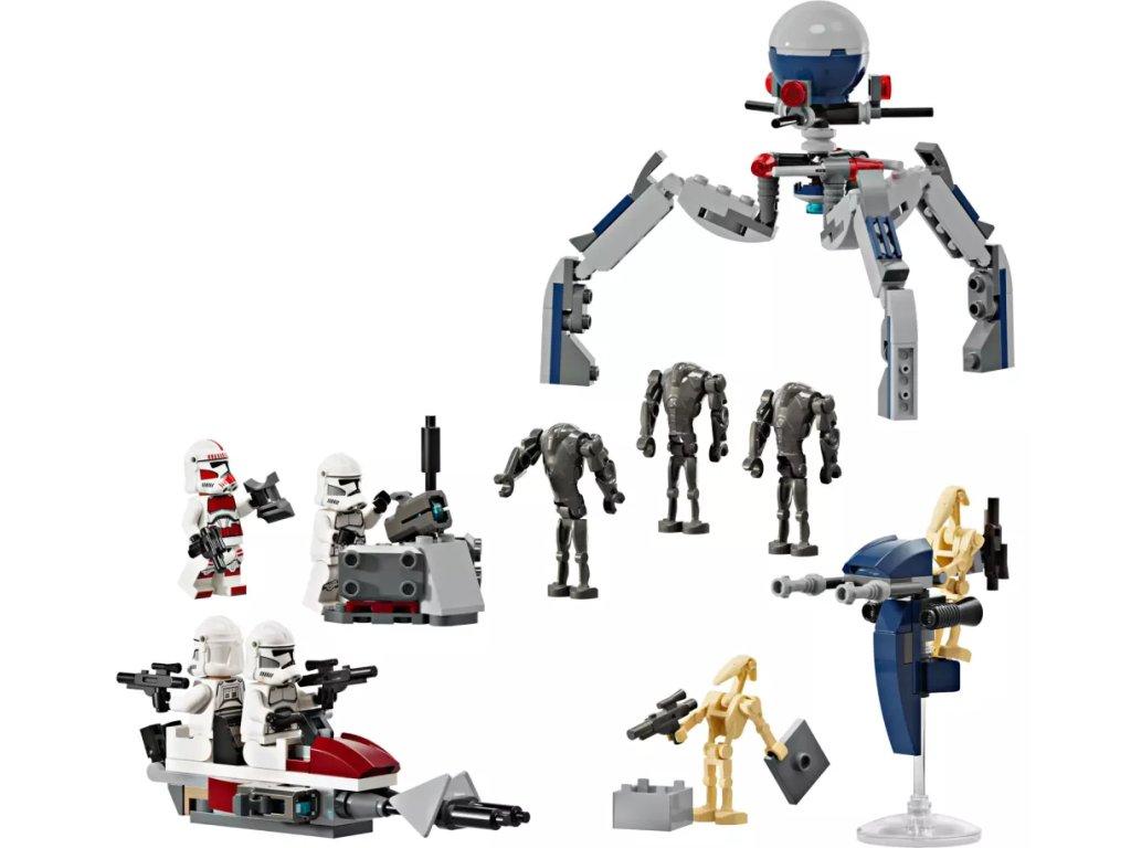 - Bitevní balíček klonovaného vojáka a bitevního droida pro děti – Připomeňte si scény ze seriálu Star Wars: Klonové války a přetvořte je do podoby z kostek LEGO® s figurkami LEGO, spídrovou motorkou a spoustou dalšího